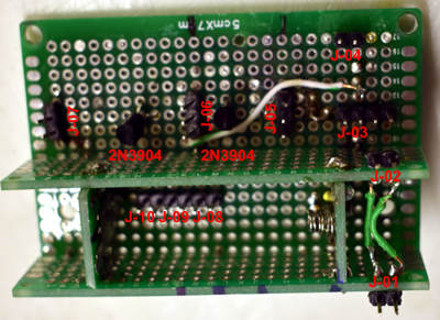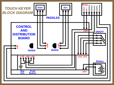The main control and distribution board consists of two of the 2N3904 circuits (one for the dot paddle and one for the dash paddle) and a series of 2 or 3 pin headers. Watch
